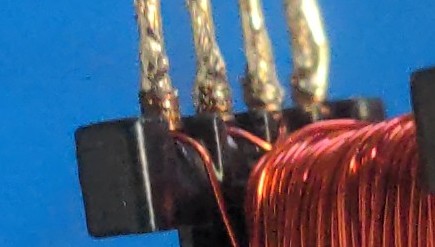 To connect the wires, the correct approach is to wrap the magnet wire around the pins, as much as feels appropriate. With 30 AWG wire, I instinctively wrapped each about four times. You can then wind the wire around the bobbin, before soldering.
