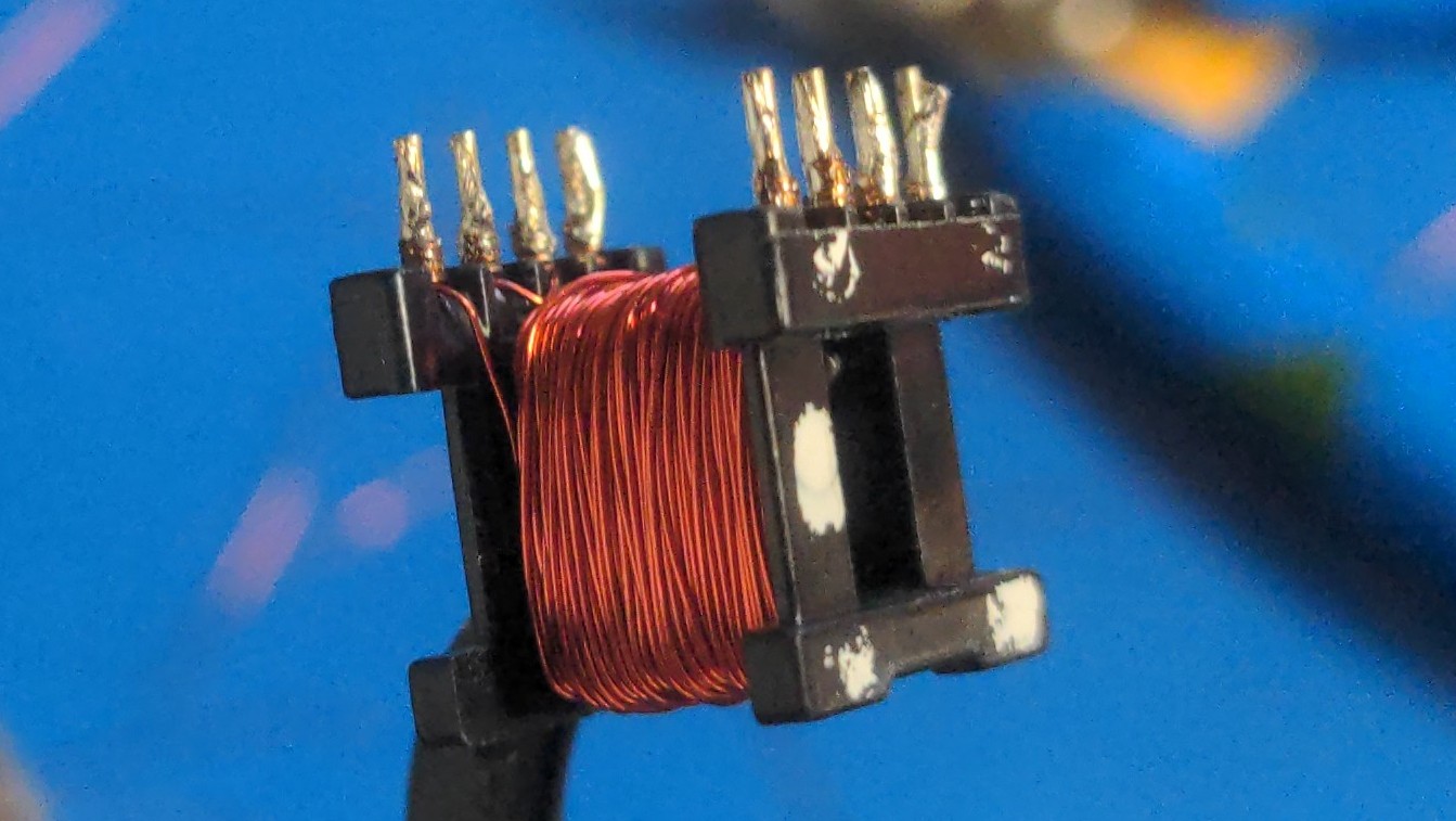 Being from AliExpress, information about the cores is lacking, and that which there is can be very difficult to parse. To find a value for AL for the cores and bobbin I had, I made an inductor with a known number of turns (arbitrary, I selected 20), and measured its inductance with my NanoVNA (approximately 110uH). In my case for these EE13 cores and bobbins, I found AL = L/N2 = 275nH/turn2.