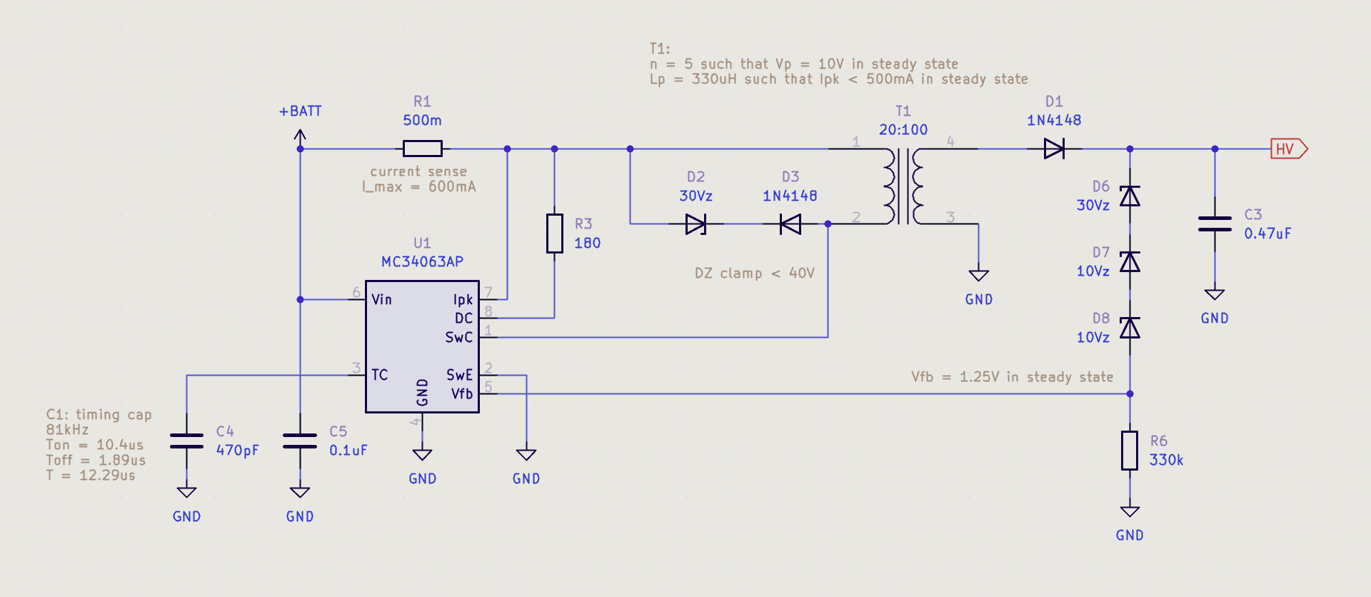 In the very very early stages of designing the first verson of my geiger counter, I had initially wanted to base the design on a flyback transformer and an MC34063. MC34063 is not a very good IC, the hysteretic control makes it very noisy, and the BJT switching transistors waste power, but its otherwise almost exactly what I implemented by using only one IC. Plus, it has current limiting. It has downsides in my application too, particularly the fairly low voltage permissible on the collector of the switch, but in theory I should be able to get away with it by using a flyback transformer. Another downside is the much lower maximum frequency.